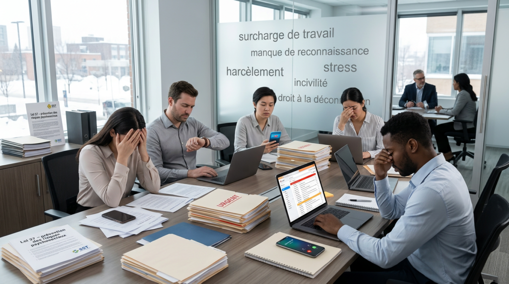 Facteurs RPS réglementaires CNESST, 10 dimensions analysées.